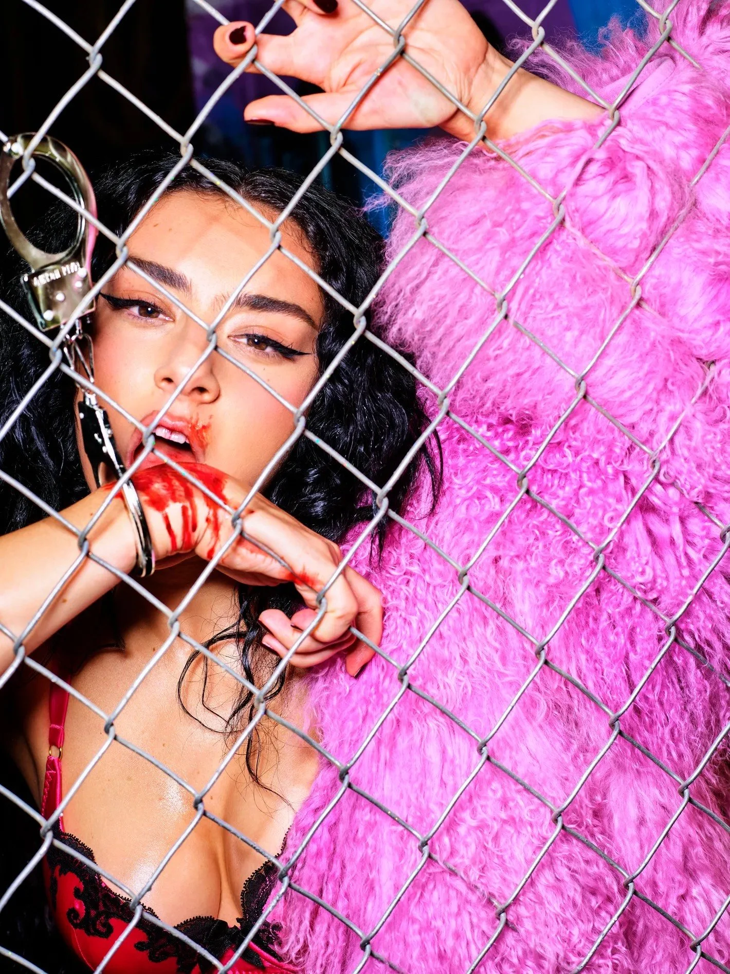 Charli XCX's collaboration with David LaChapelle for New York Magazine's Fall 2024 issue featured this striking pink coat from the luxury brand Retrofête. This ensemble was part of a larger fashion narrative that blended vintage glamour with a modern edge, capturing Charli's bold persona as she navigates the complexities of fame. The photoshoot, characterized by its surreal and cinematic qualities, showcased Charli in various dramatic scenarios, including a scene where she appears to escape paparazzi while still wearing handcuffs, symbolizing the entrapments of stardom.